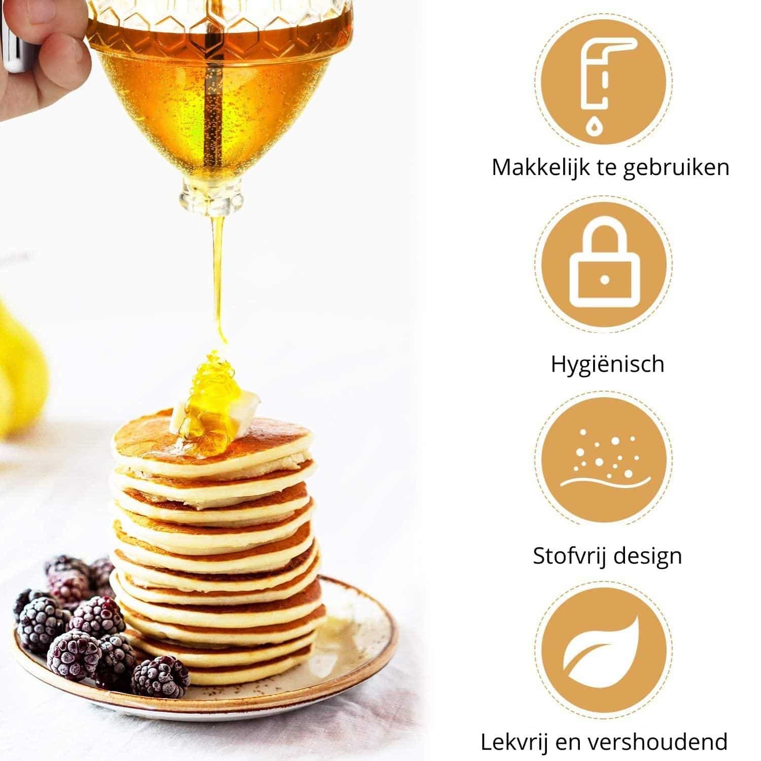Deze elegante honing dispenser is een perfecte aanvulling voor in je keuken! Het stopt rommelig honinglekken en maakt je honing onmiddellijk beschikbaar. Druk gewoon op de ontgrendeling op het handvat en het stroomt direct uit de bodem. Laat de hendel los en het stopt onmiddellijk zonder te druppelen.